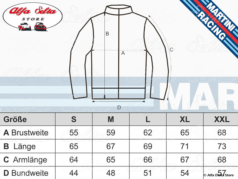 - Original 1970s style with wide zippers, woven Martini stripes on the sleeves, and embroidered original MARTINI RACING patch on the chest.